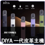 DIYA 叮啞皮革主機,搭載 8W / 10W 雙段功率輸出,可依個人喜好自由切換,並配備 LED 液晶顯示螢幕,電量與模式一目了然。高質感皮革包覆,手感舒適、防滑耐用,支援各式一代規格煙彈,新手老手都適合。