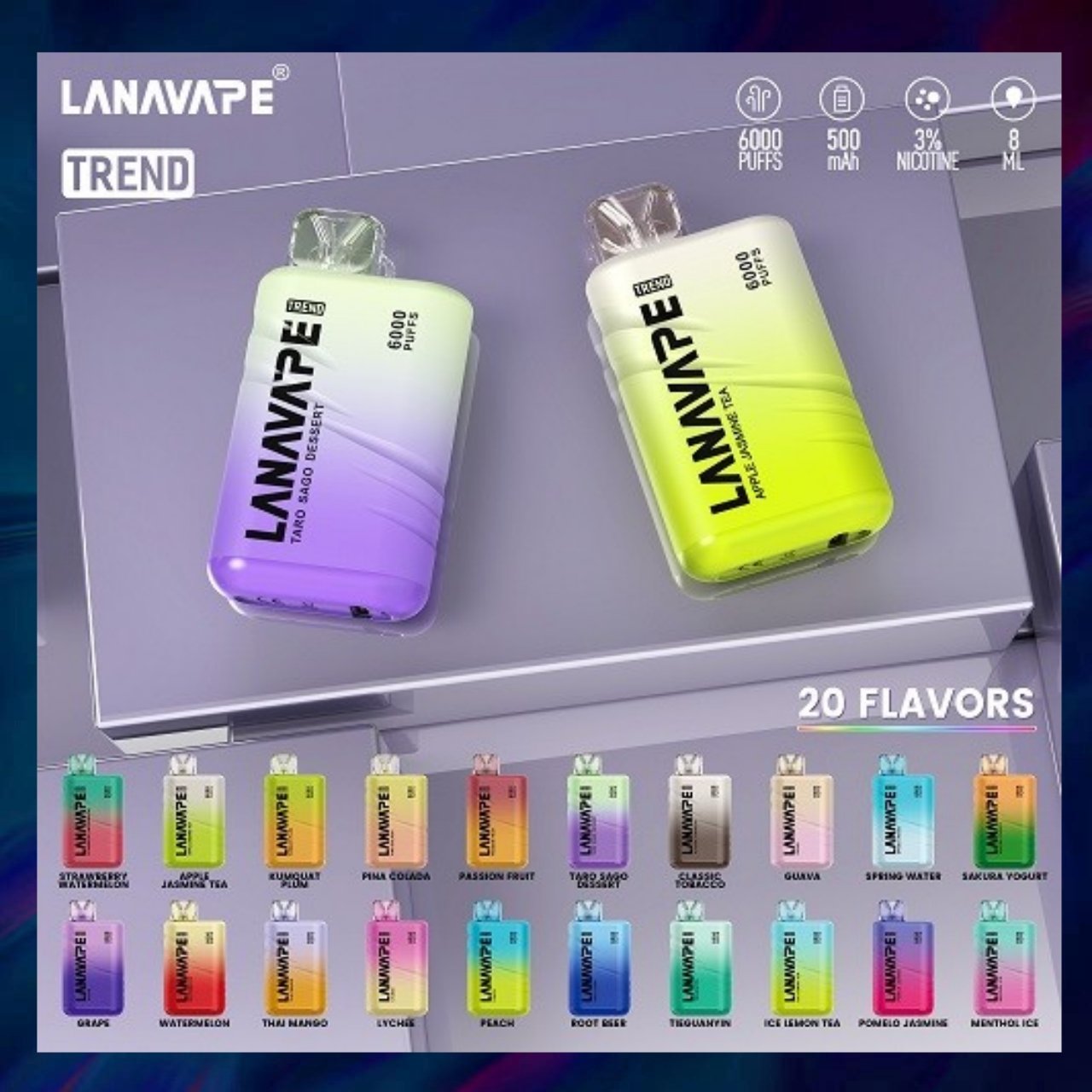 LANA 6000口拋棄式電子煙主打 高口數、大煙量、口感穩定,單支可使用約 6000 口,適合長時間使用族群。煙霧濃郁細膩,涼感與風味表現均衡,是 LANA 系列中最受歡迎的高續航機型之一。
